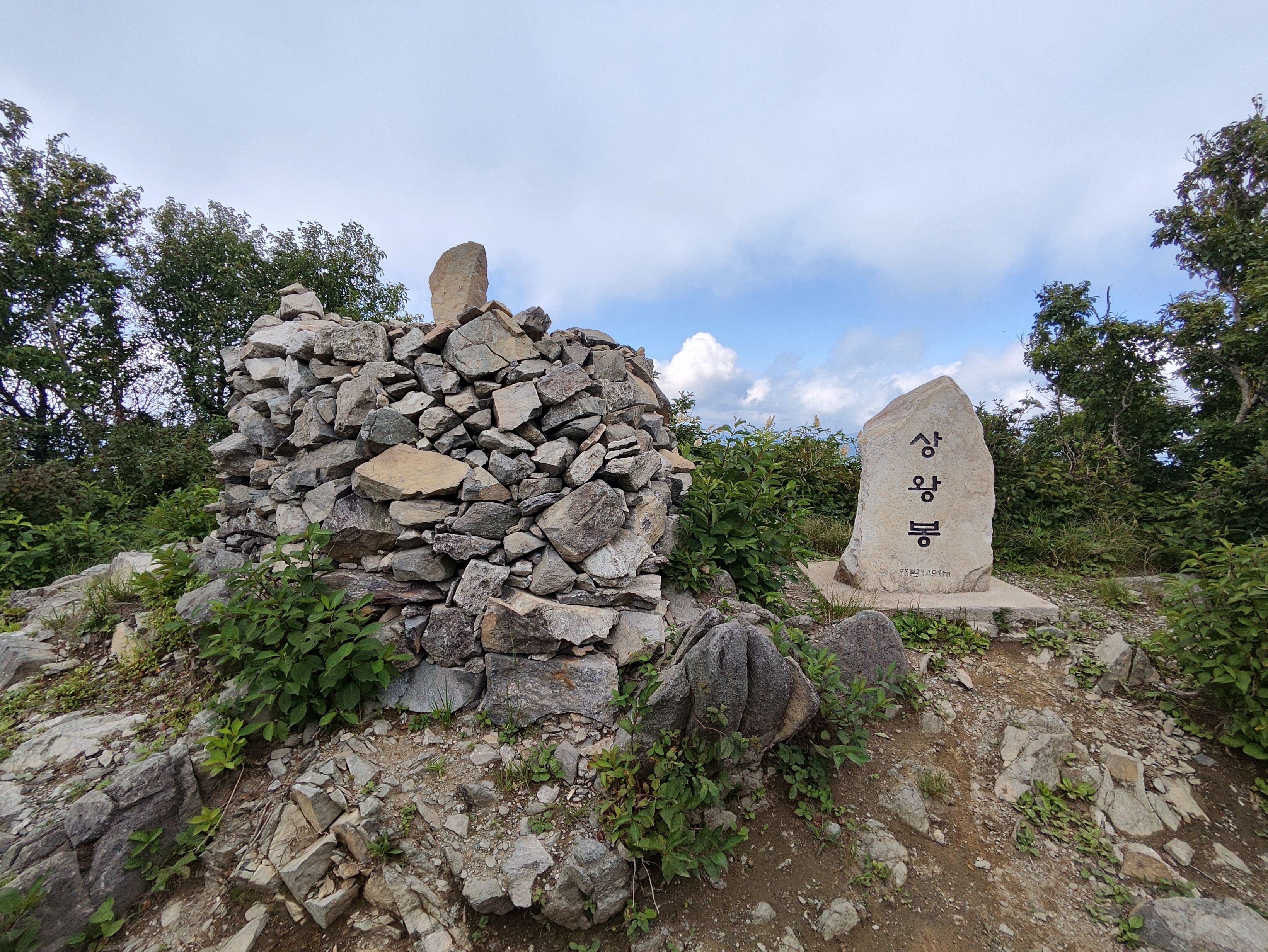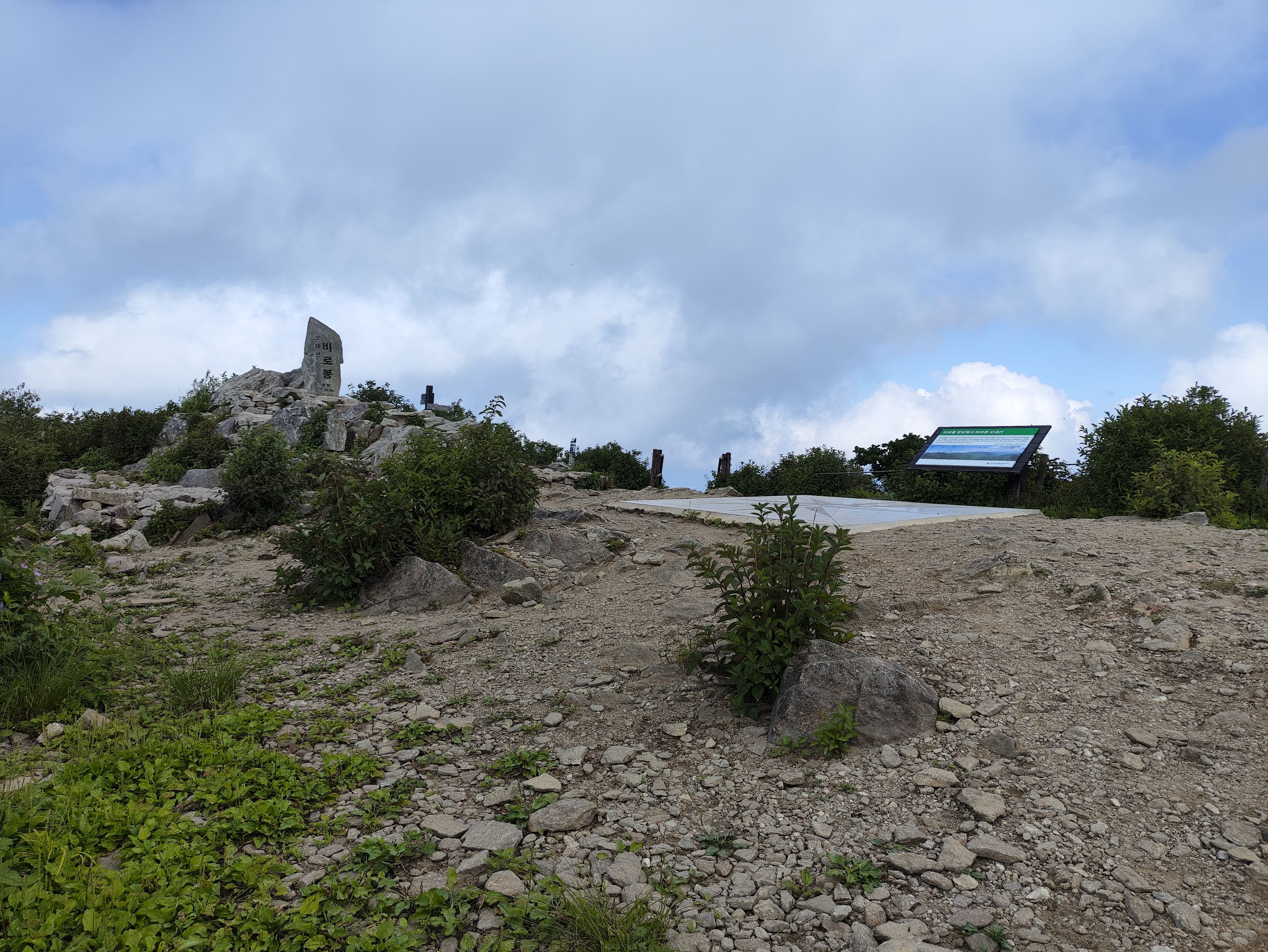 2시간 정도 걸려 오대산 정상 비로봉 도착.. .1563미터입니다. 흙산인데 돌이 있는 것으로보아 다른데서 가져왔거나 주변에서 티끌모으듯 주워모았거나.