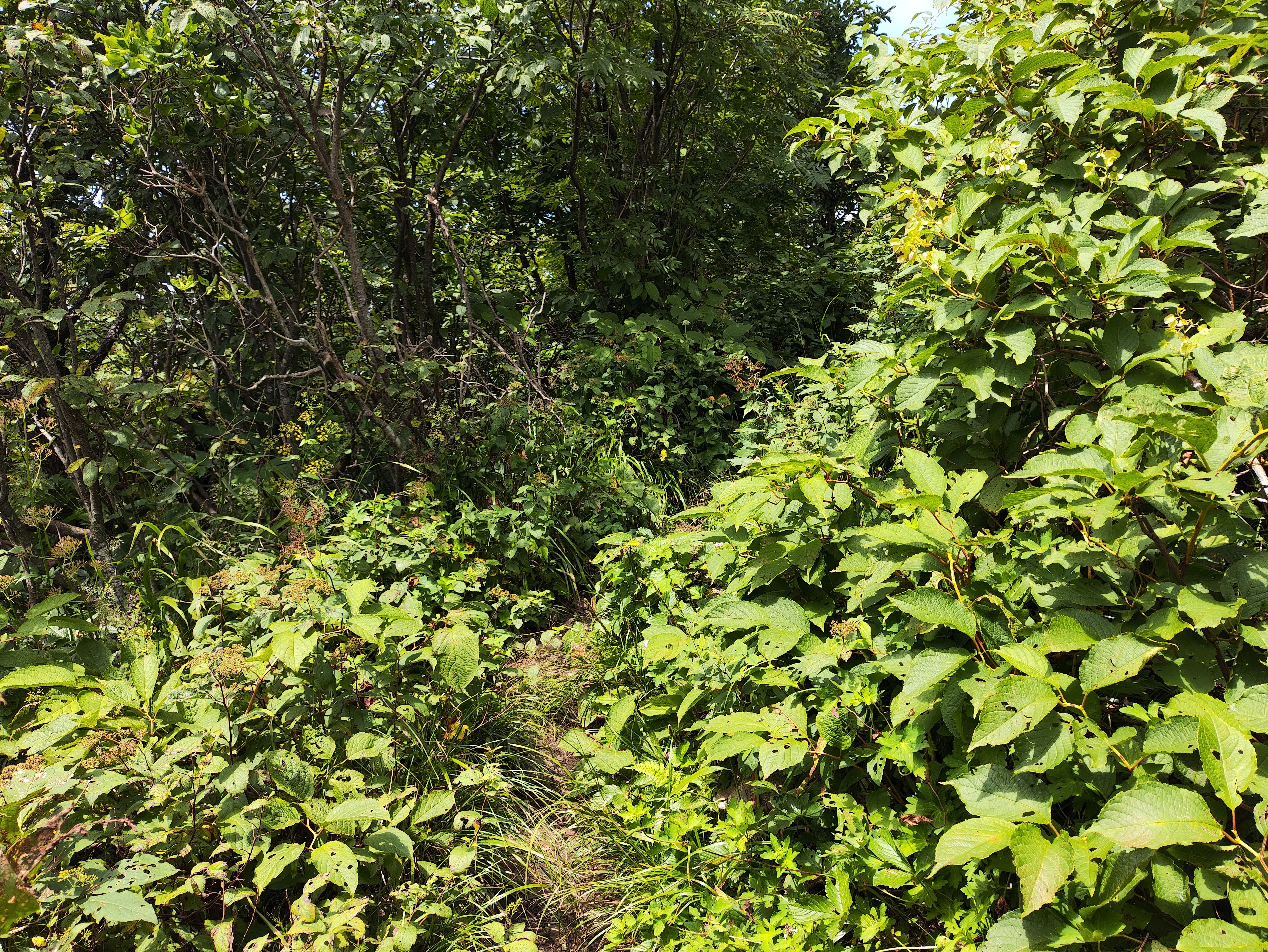 상왕봉 가는 길... 능선길인데 거의 수풀을 헤치고 간다고 보면 됩니다. 남덕유산에서 서봉가는 길이랑 비슷합니다. 이런 수풀길 싫어하는 편이라 알았으면 가지 않았으나 일단 몇 미터라도 발걸음을 옮겼으니 그냥 갑니다. 다른 분들에게는 그리 권하고 싶지는 않습니다. 특히 반바지는 더더욱...