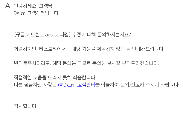 많은 분들이 티스토리측에 해결책을 요구했는데 보통은 구글 애드센스측에 문의하라는 답변만 받는다고 하네요.
