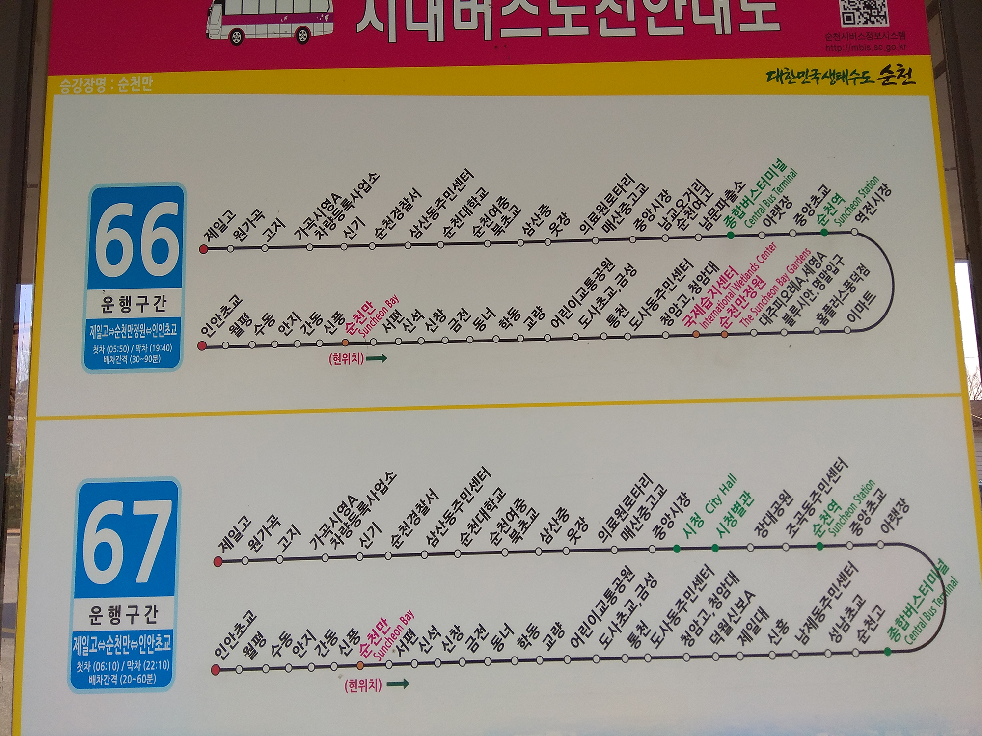 대중교통은 순천버스터미널이나 순천역에서 66번 또는 67번을 타면 됩니다. 지방도시라 길이 막히지 않아서 오래 걸리지는 않아요.