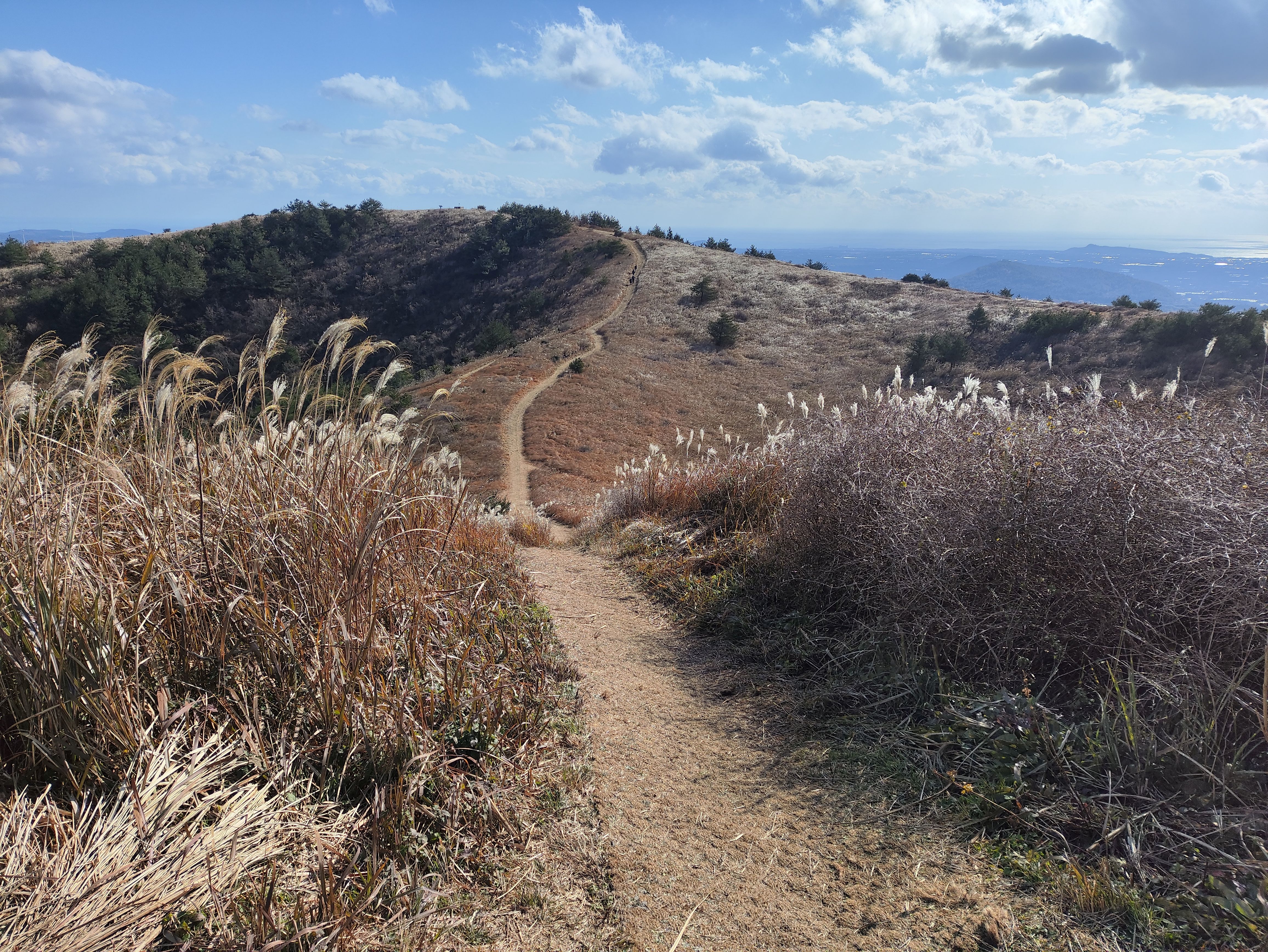 갈대와 나무가 뒤섞인 길입니다. 멀리 다른 오름들도 보이고 바다도 보이고.