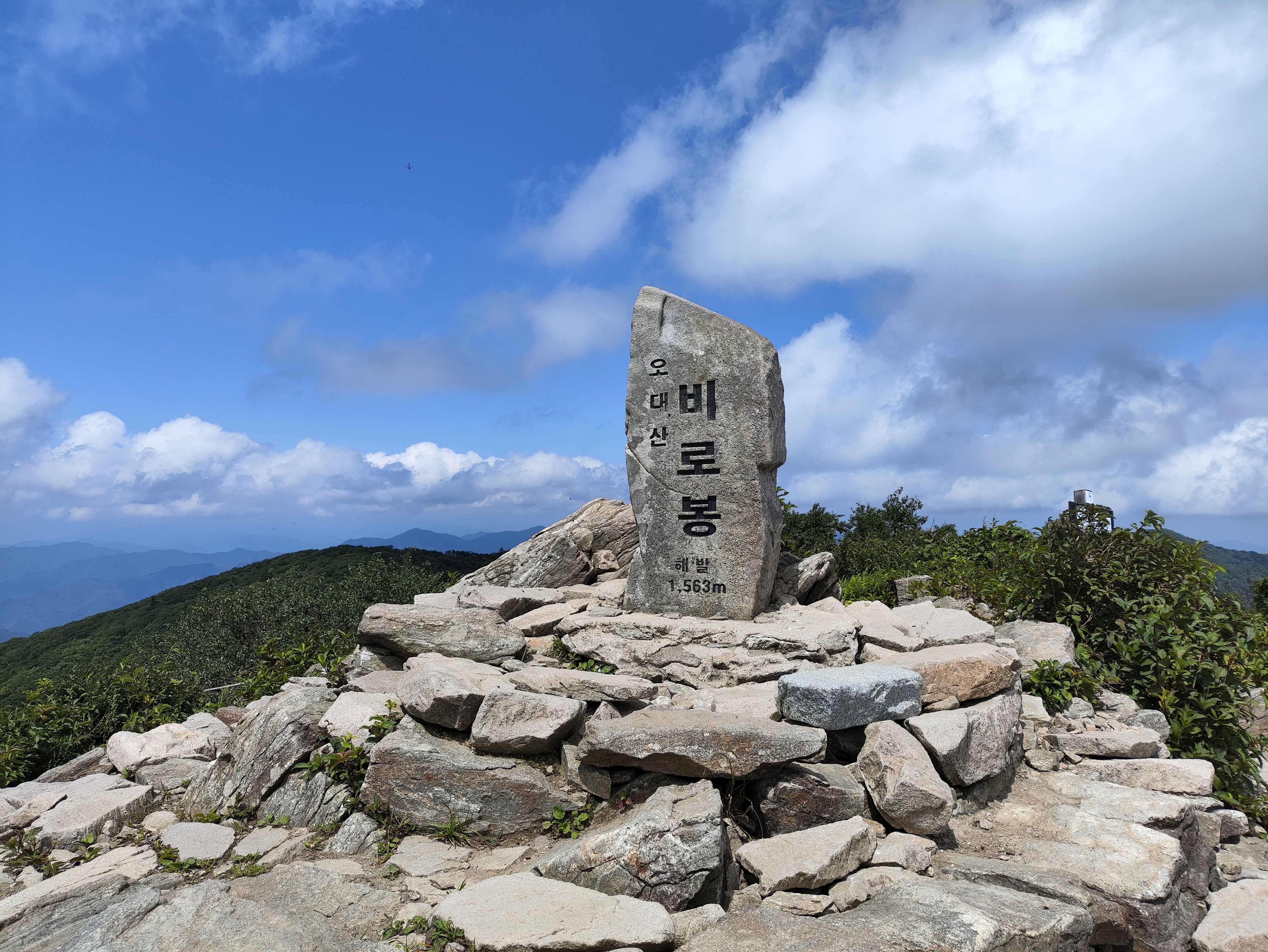 2시간 정도 걸려 오대산 정상 비로봉 도착.. .1563미터입니다. 흙산인데 돌이 있는 것으로보아 다른데서 가져왔거나 주변에서 티끌모으듯 주워모았거나.