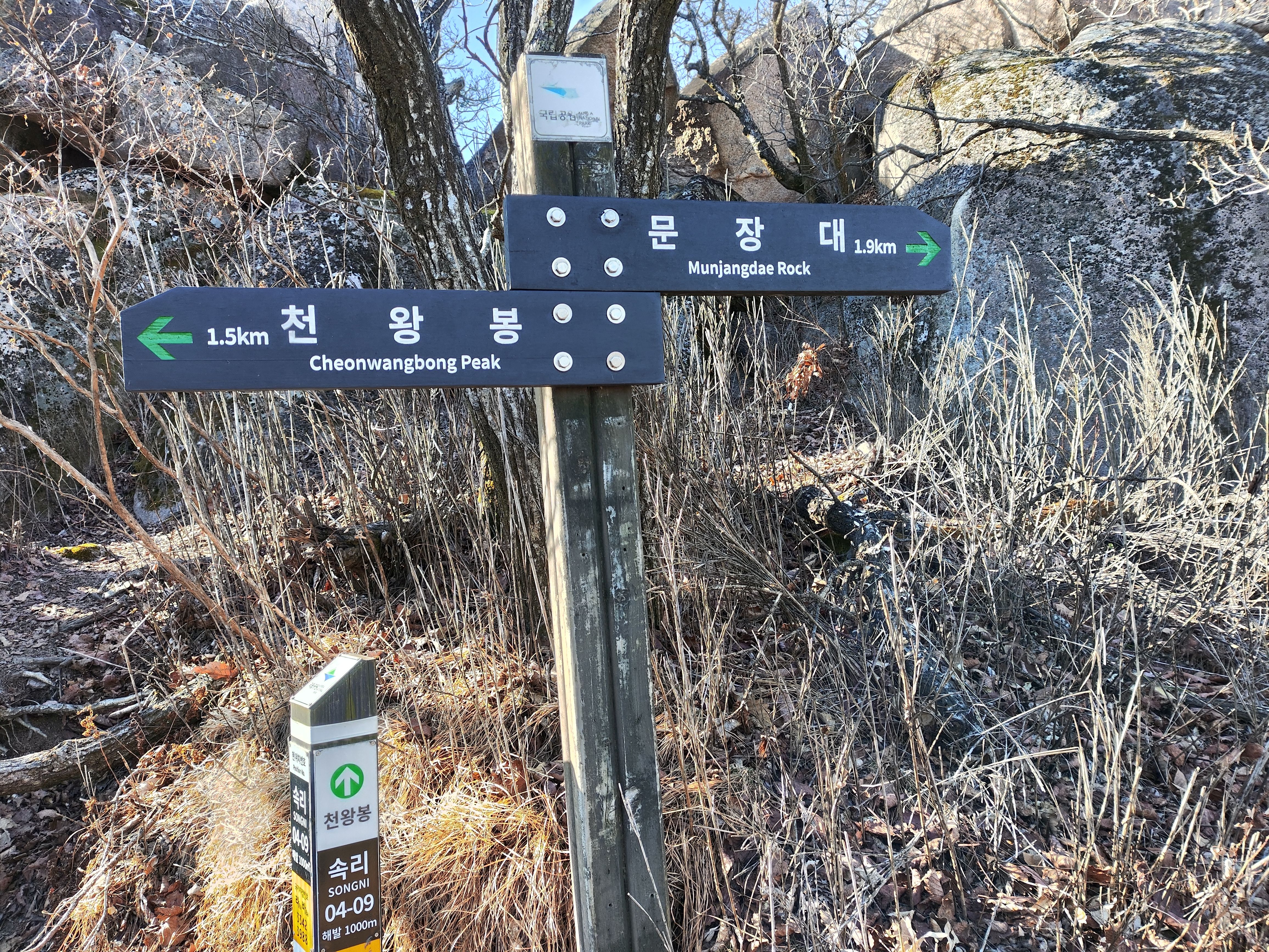 주차장에서 대략 6km 걸어서 도착한 갈림길. 천왕봉까지 6백미터 남았네요. 문장대까지는 2.8km 입니다. 저는 우선 천왕봉 찍고 다시 이곳에 와서 문장대로 갈 겁니다. 갈 길이 멀어요.