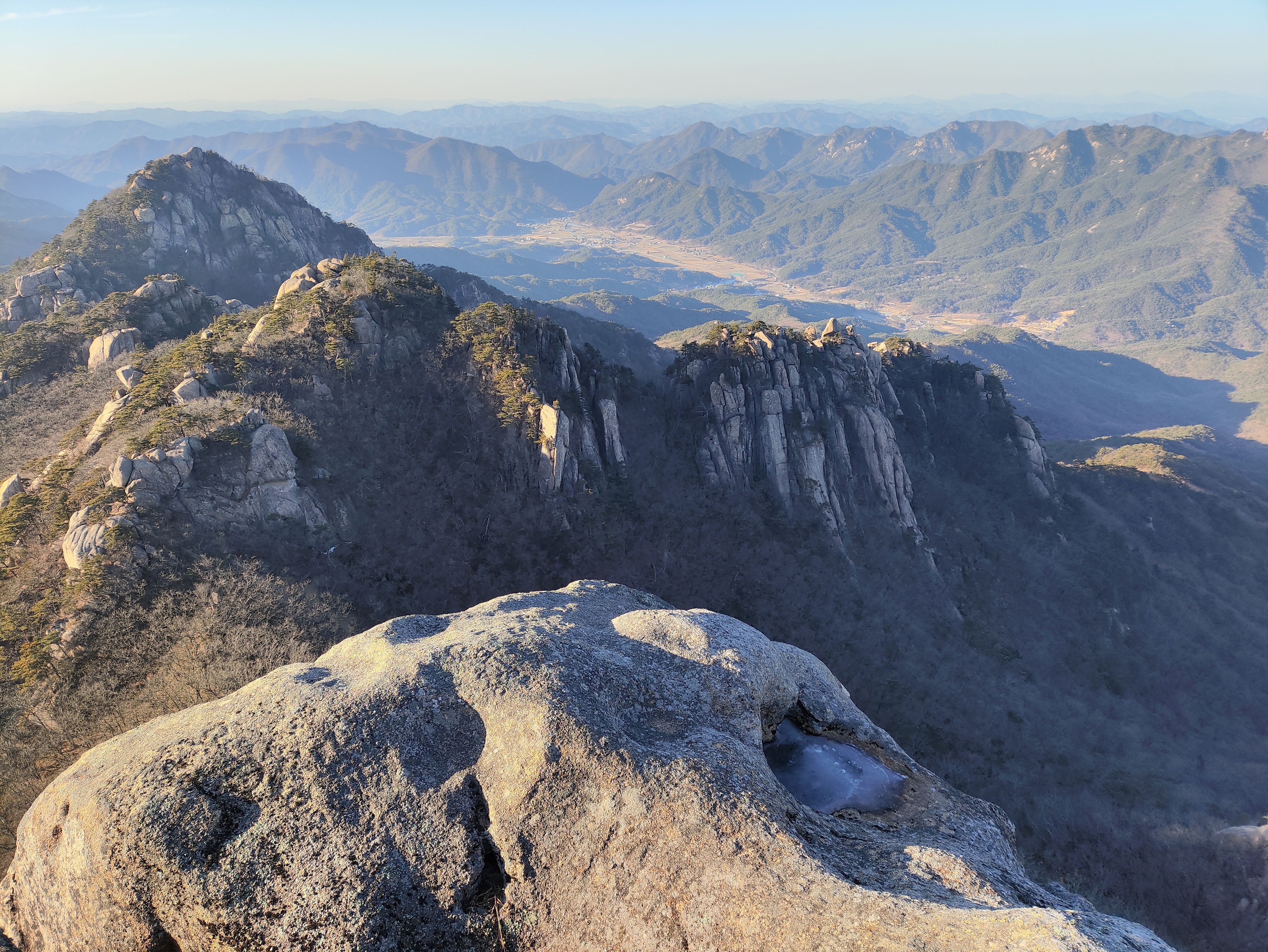 드디어 문장대.. 고인 물은 얼어있더군요. 잠시 쉬었다 갑니다. 시간은 오후 4시가 넘어 내려갈 일만 남았는데 잠시 경치 보며 쉬어갑니다. 문장대 부근은 천왕봉보다 훨씬 경치가 좋네요.